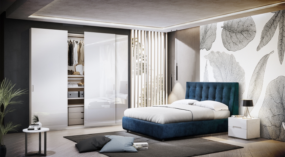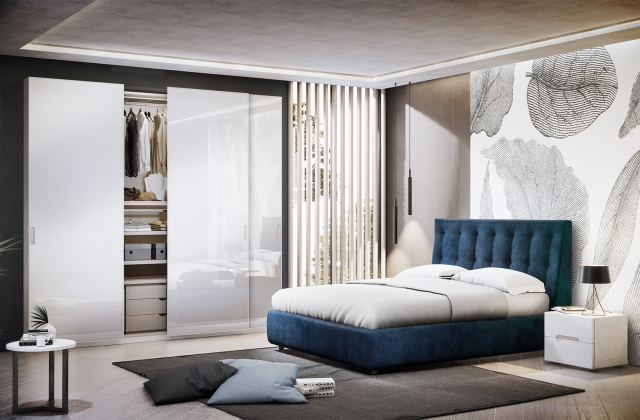 Prussia è una camera matrimoniale composta da armadio a tre ante scorrevoli con ante in vetro bianco cristallino, letto modello Ninfea con testata e giroletto imbottiti e rivestimento in velluto blu notte per accompagnarti al meglio nel mondo dei sogni. Infine, il gruppo notte Lizbet chiude la composizione donando alla stanza uno spazio di organizzazione.