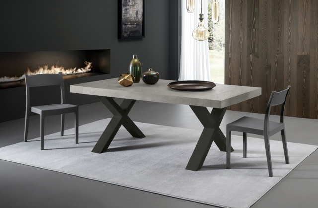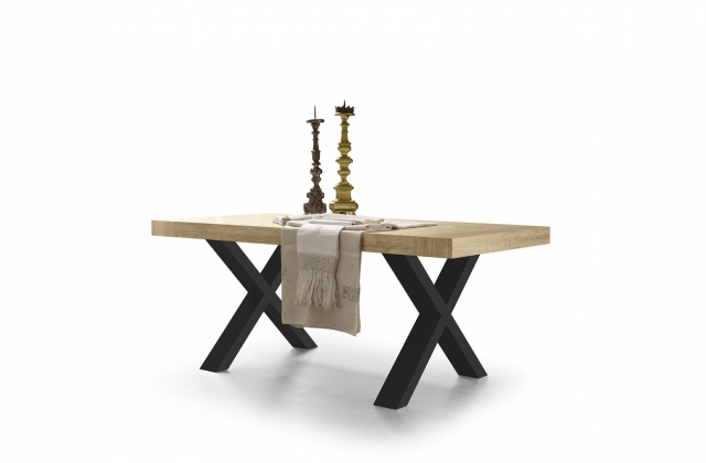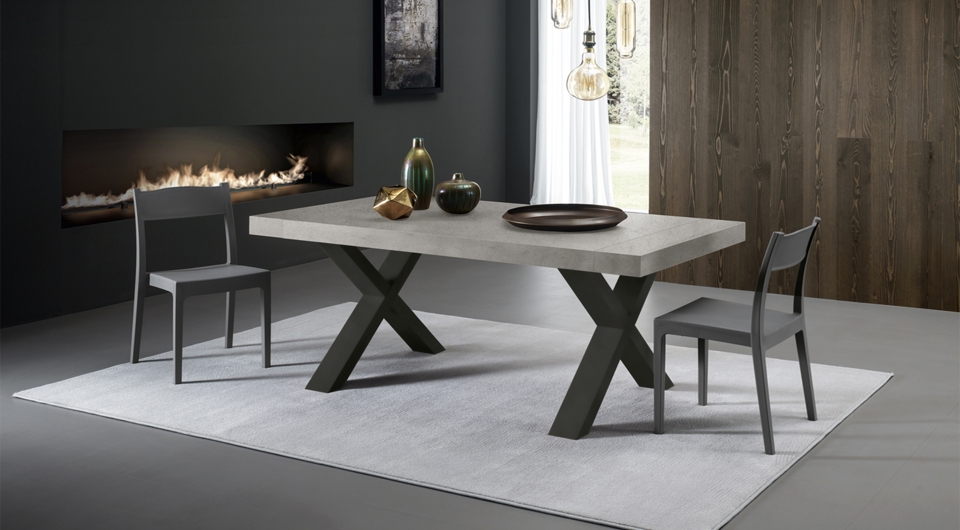 Tavolo allungabile con basamento in melaminico nero opaco, piana e allunghe in melaminico con bordo da 8 cm.