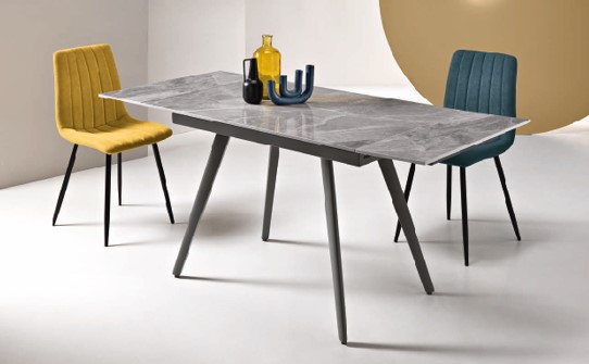 Pratico tavolo allungabile con due allunghe centrali da 30 cm per poter accogliere al meglio i comodi pranzi della domenica da passare con amici o parenti; le gambe sono realizzate in metallo verniciato, mentre il top è in pietra sinterizzata effetto marmo.