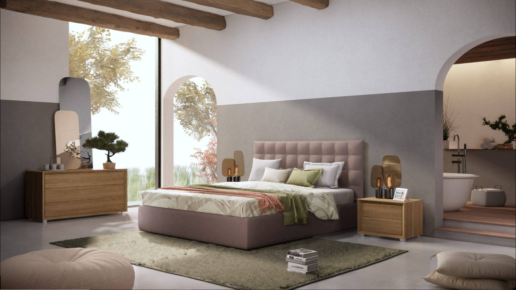 Un letto dalla grande qualità grazie alle cuciture a quadri della testata abbinate alla morbida ovatta all'interno.