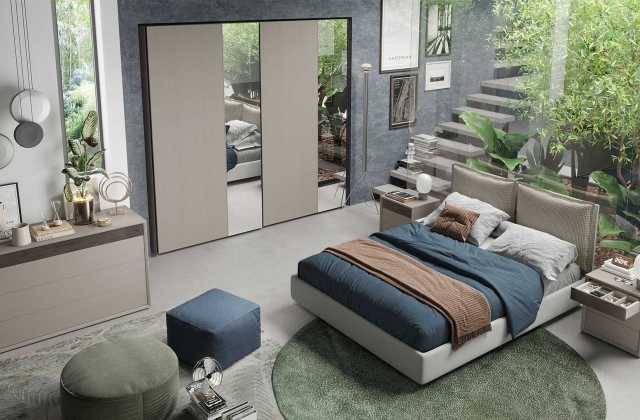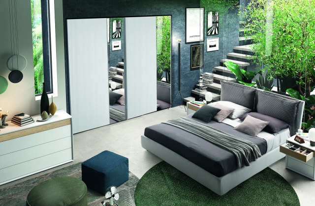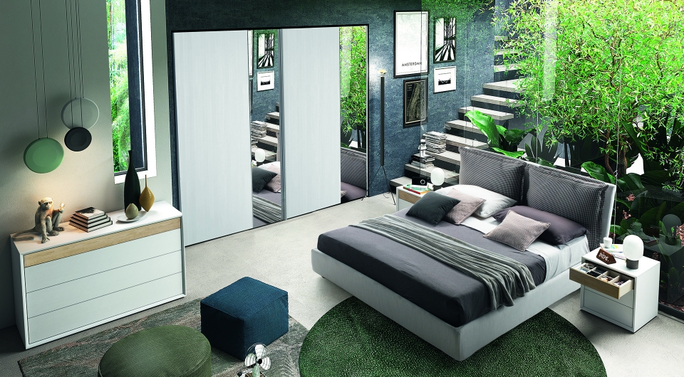 Camera da letto composta da armadio Musa a due ante scorrevoli in finitura bianco frassinato e specchi riflettenti, e da comò e comodini Rover in quercia e bianco frassinato.