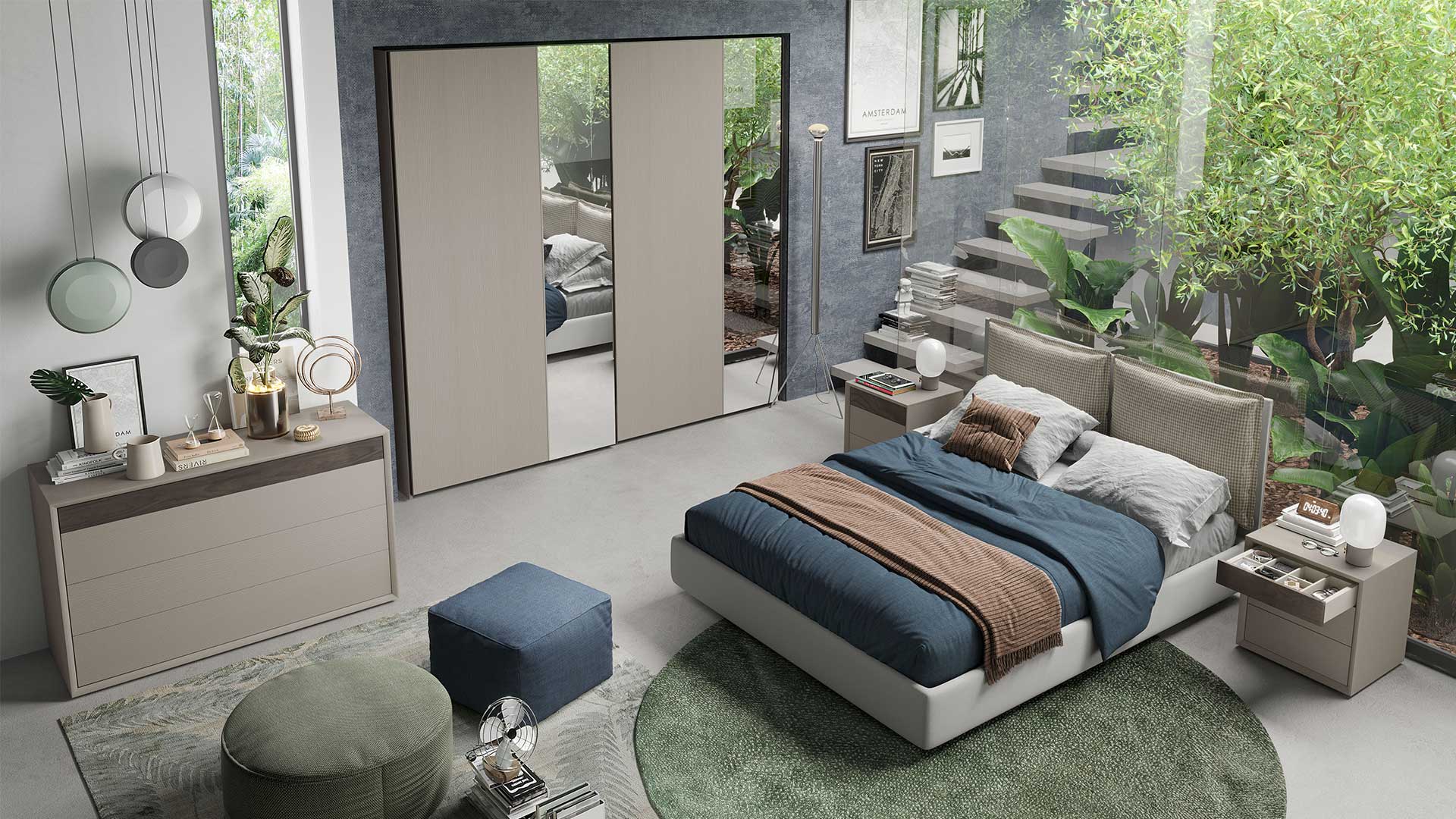 Camera da letto composta da armadio Musa a due ante scorrevoli in finitura bianco frassinato e specchi riflettenti, e da comò e comodini Rover in quercia e bianco frassinato.