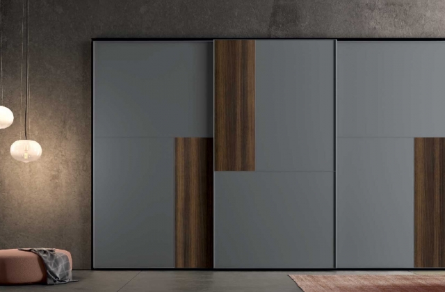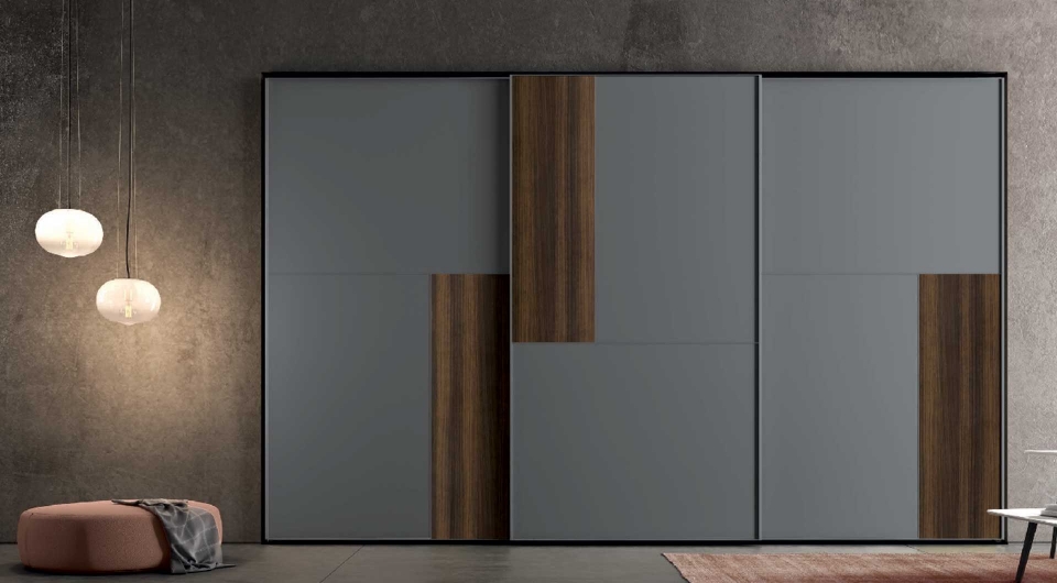 Caratterizzato da un'anta scorrevole di 18 mm di spessore, i suoi pannelli presentano settori modulabili con presa maniglia a tutta altezza.