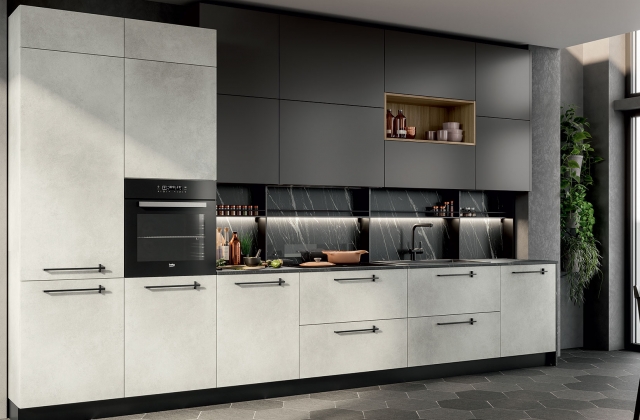La caratteristica anta liscia è resa più sofisticata dall'utilizzo della maniglia, che crea un ambiente pulito e altamente funzionale, che si adatta perfettamente a spazi ridotti, senza sacrificare lo stile.