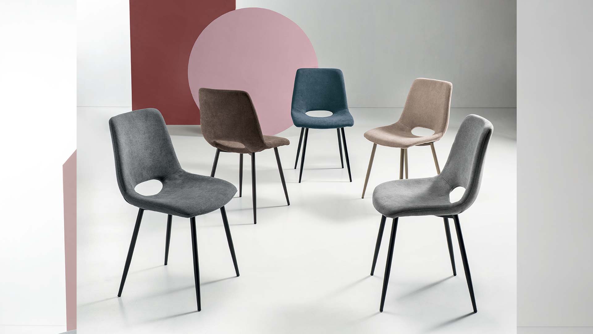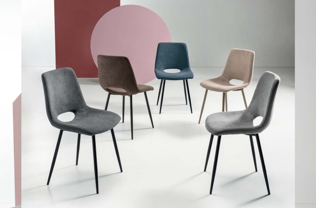 Sedia in tessuto con struttura in metallo. Disponibile in diversi colori.