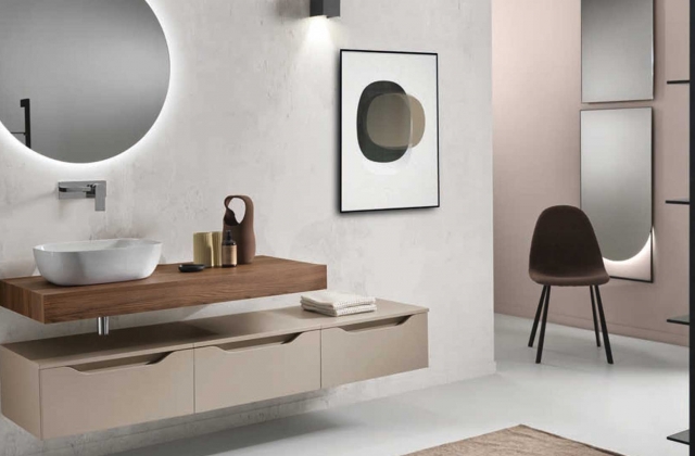 Mobile bagno sospeso composto da top L.140, modulo 80 cm, modulo 60 cm, lavabo da appoggio, specchio Ø 80 cm con led.