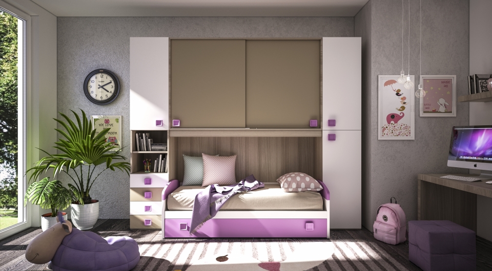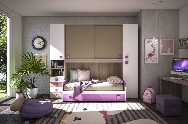 • possibilità di scegliere tra oltre 40 colorazioni delle ante e delle strutture (effetto legno, o tinta unita) dei mobili, e oltre 200 colorazioni per il letto