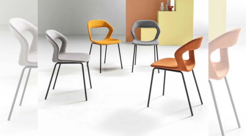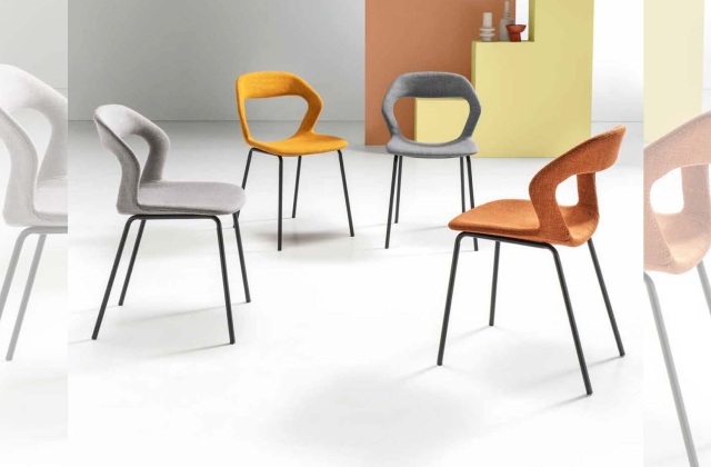 Sedia imbottita in tessuto con struttura in metallo. Disponibile in diversi colori.
