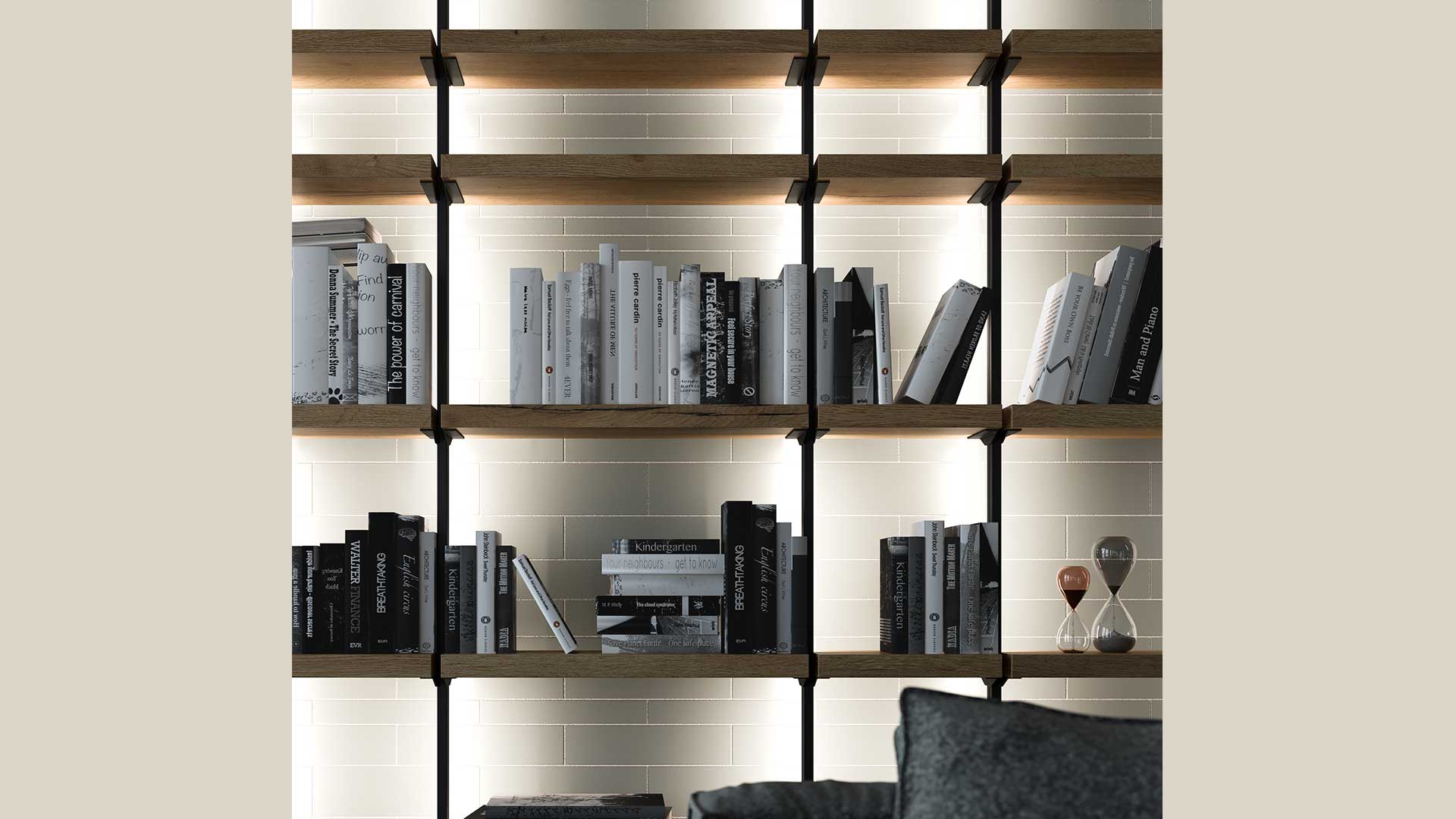 Su richiesta la libreria può essere accessoriata con luci LED incorporate per creare un effetto “wall wash”, una sorta di cascata luminosa sul muro in grado di creare un'atmosfera calda e soffusa.