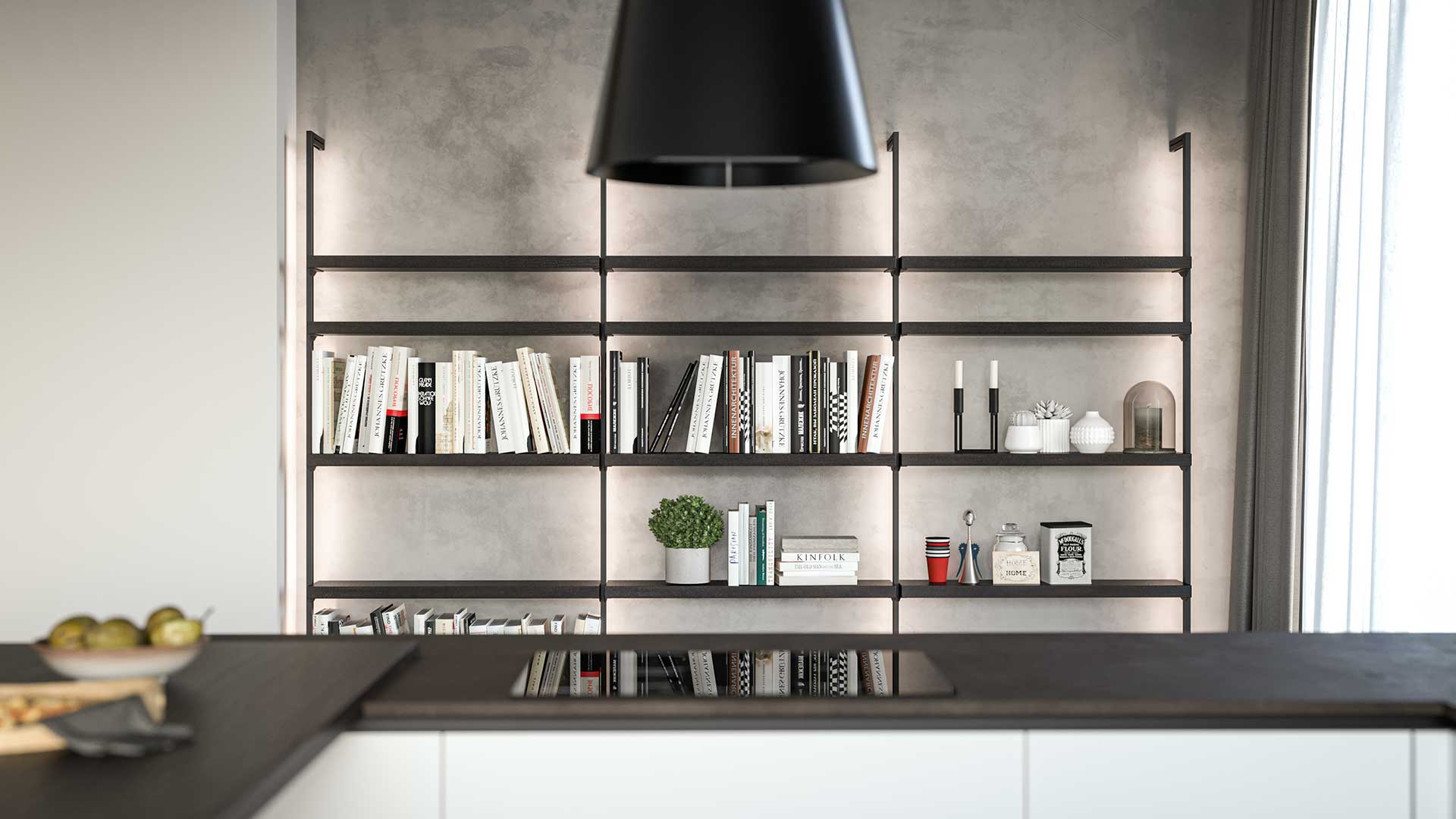 Stair è un elemento che permette di creare molteplici soluzioni di parete attrezzata. Composta da una trafila di alluminio tramite il fissaggio a parete può essere installata freestanding o come completamento della cucina.