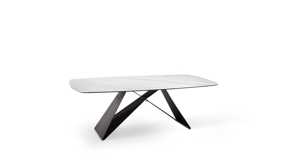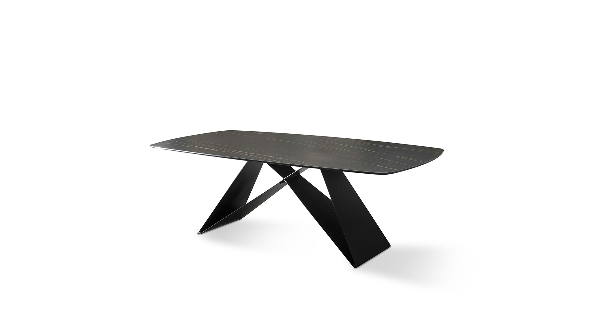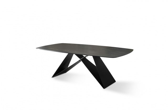 Tavolo in ceramica su vetro temperato, dotata di particolare superfice effetto portoro e struttura in metallo verniciato che lasciano libera espressione all'immaginazione.