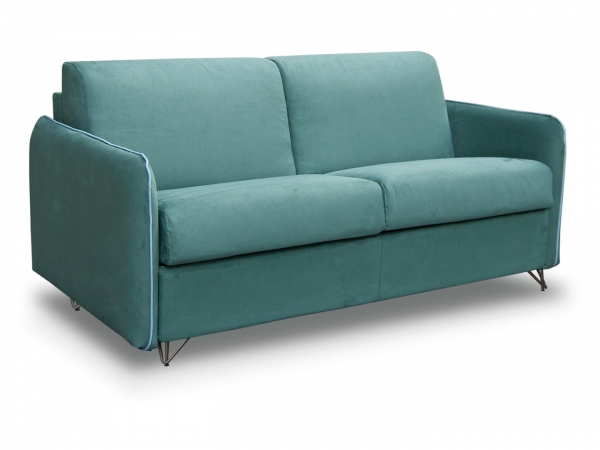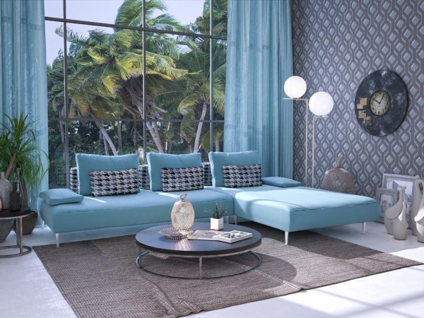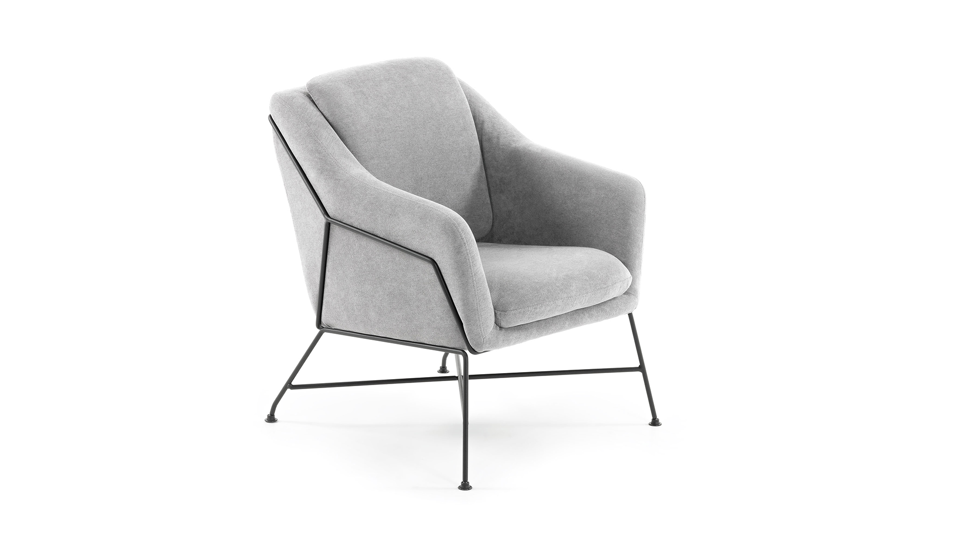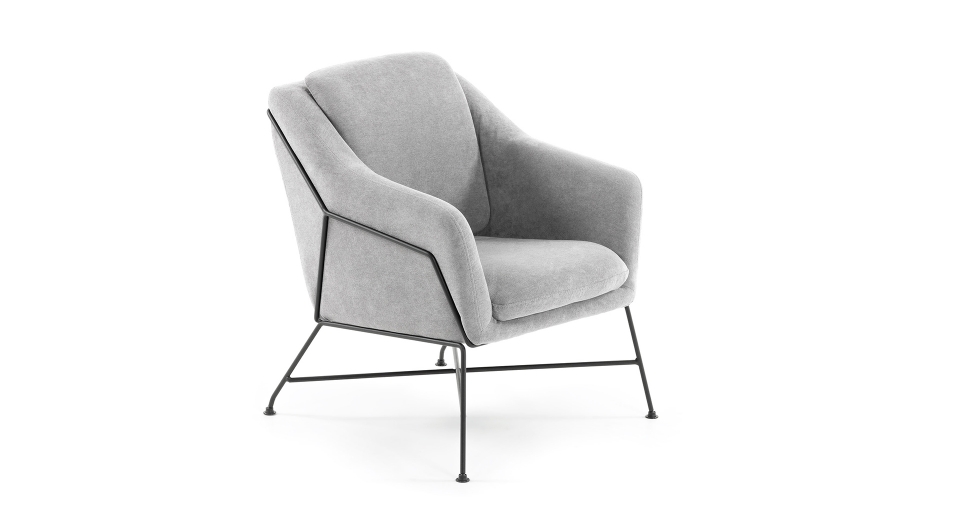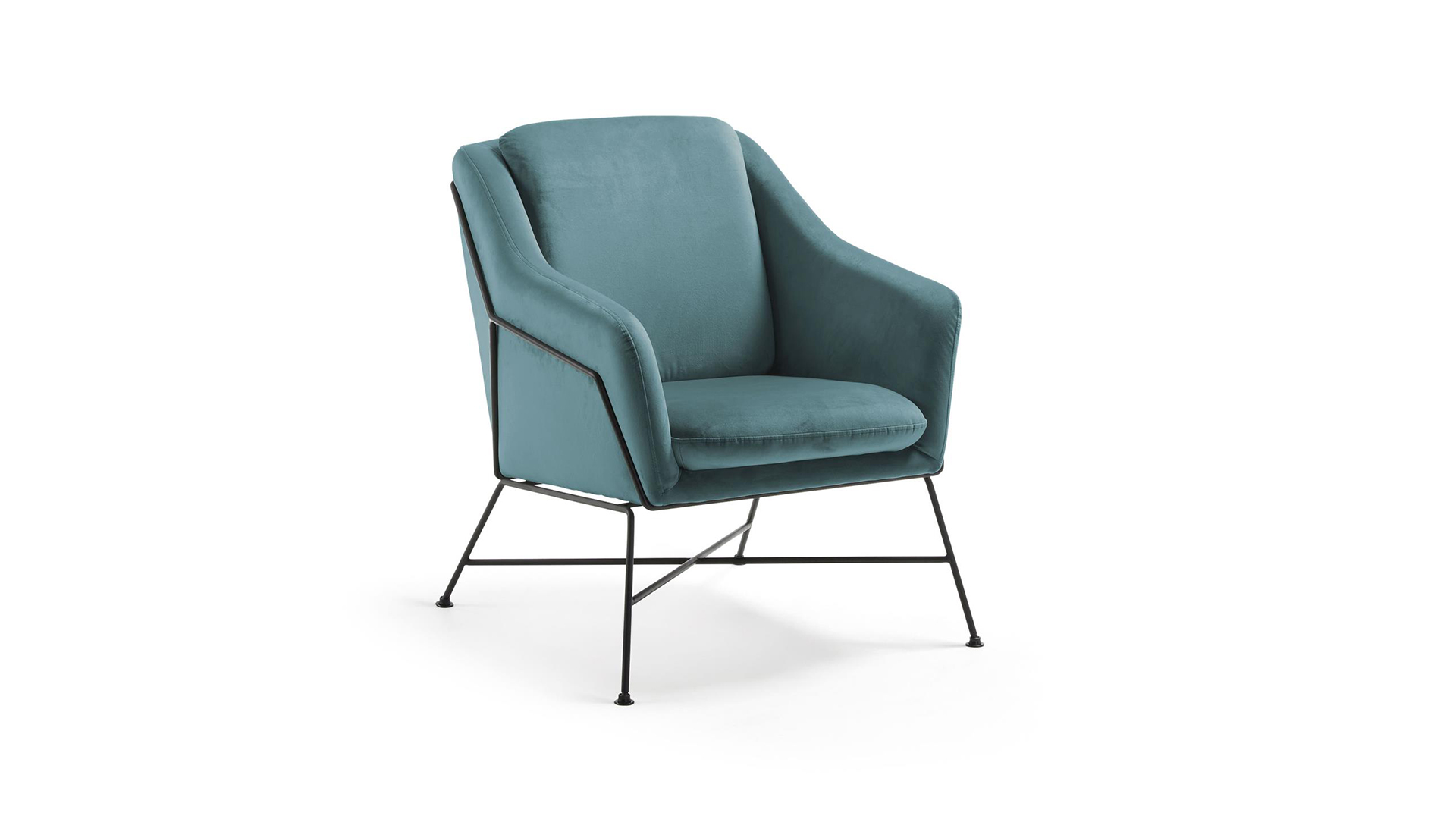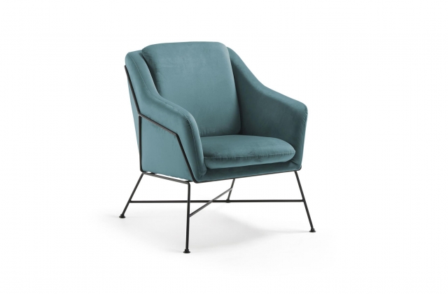 La poltrona Tessa,  grazie al suo rivestimento in velluto turchese e ai suoi volumi asimmetrici, segue la tendenza della struttura a vista tipica del design contemporaneo.