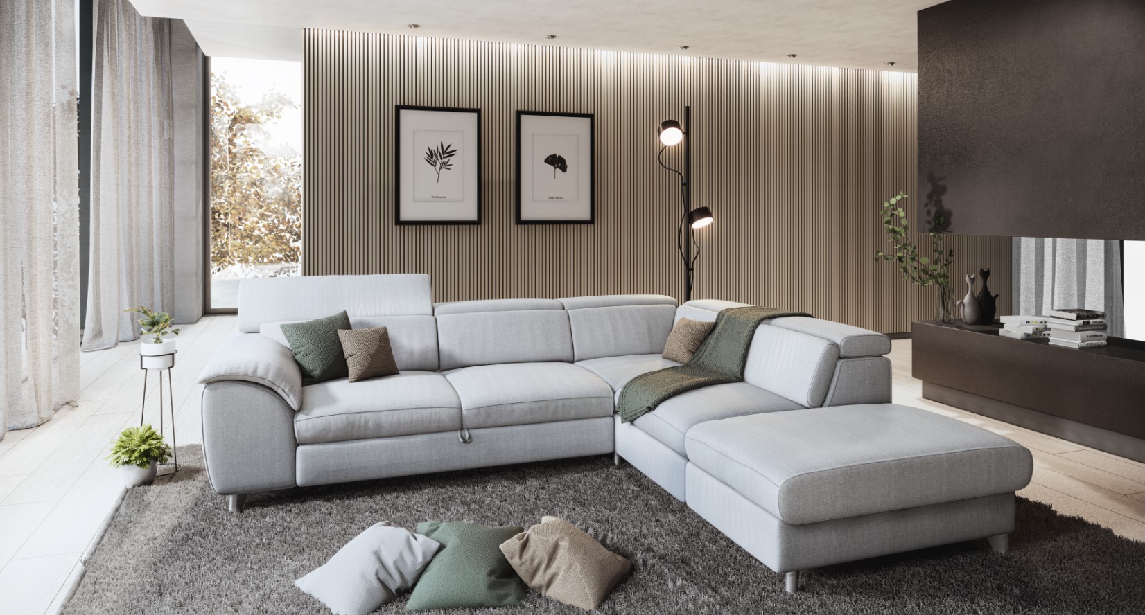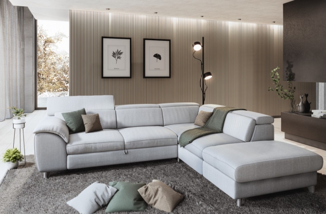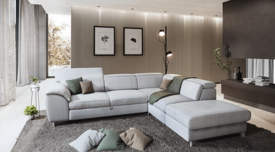 Victory è un divano angolare a 5 elementi, parzialmente sfoderabile, disponibile in vari tessuti e colori.
