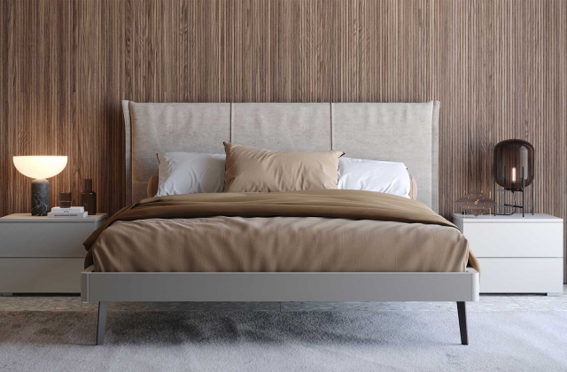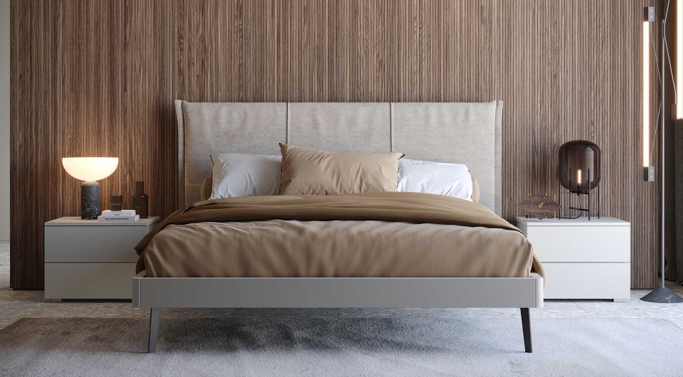 Deciso e rigoroso, il letto matrimoniale Yama, realizzato in finitura laccato opaco cotone. La testata imbottita e il giroletto in legno doneranno un tocco vivace e al tempo stesso elegante alla tua camera da letto.